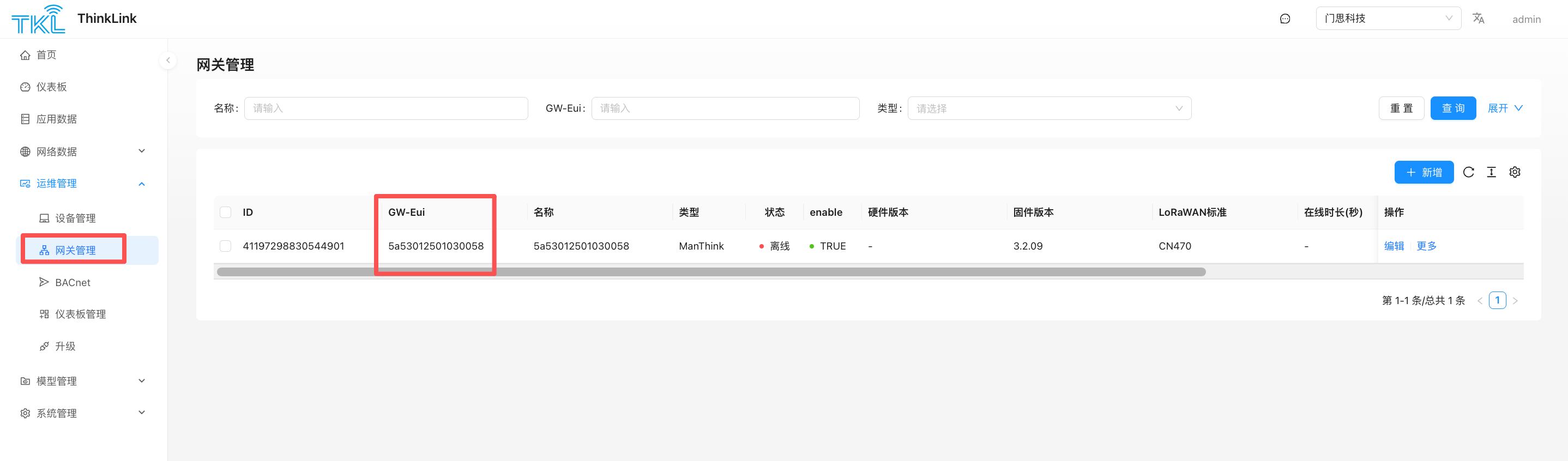 在 运维管理->网关管理 菜单中可以发现对应的网关,如果没有找到该网关,则需要点击新增,输入网关的eui和pincode,网关类型选择 ManThink对网关进行认领。