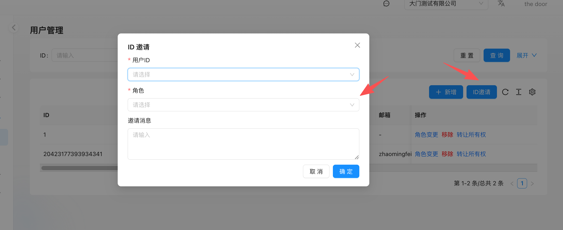 - 点击“邀请用户” 按钮,弹出邀请对话框。