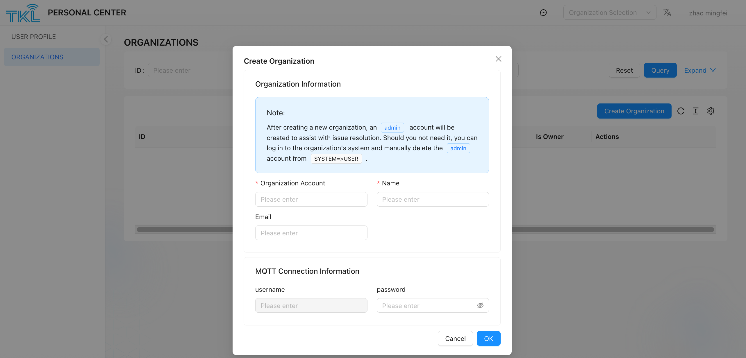 it is applicable to users who want to create a new organization and serve as its administrator. Note that after the user adds a new organization, the admin account will be automatically added to assist the user in handling problems. If the admin account is not required, please log on to the system page of the organization and clickSystem ->User delete admin manually.