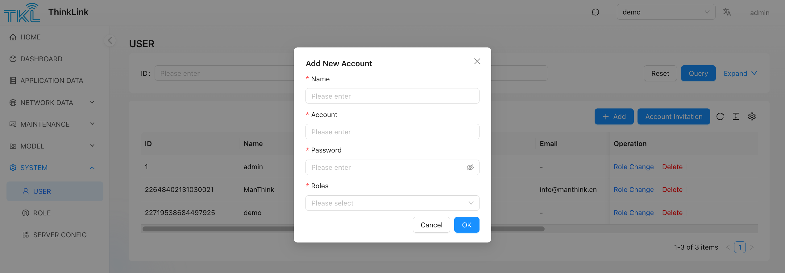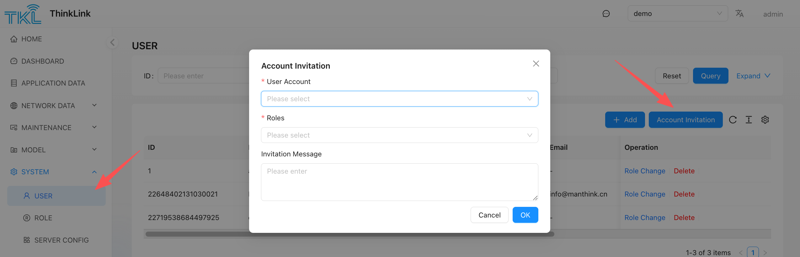 operation Path: SYSTEM → USER → Account Invitation