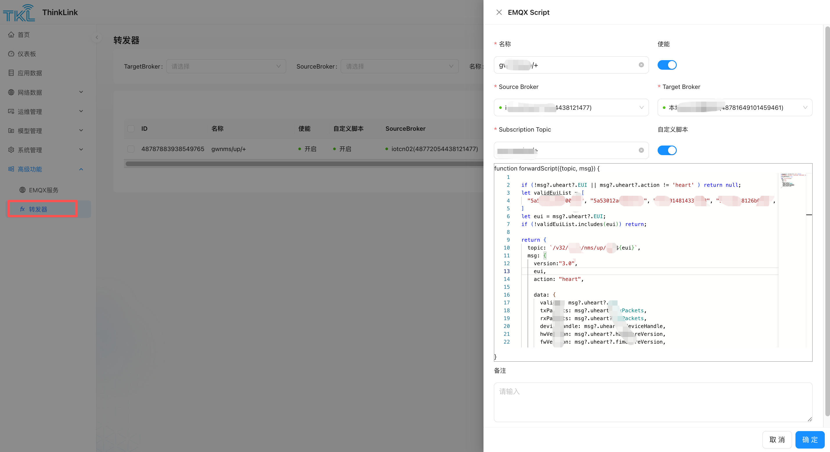 MQTT转发器是用于实现第三方应用平台协议对接的中间件解决方案,通过灵活的JS脚本处理实现:
