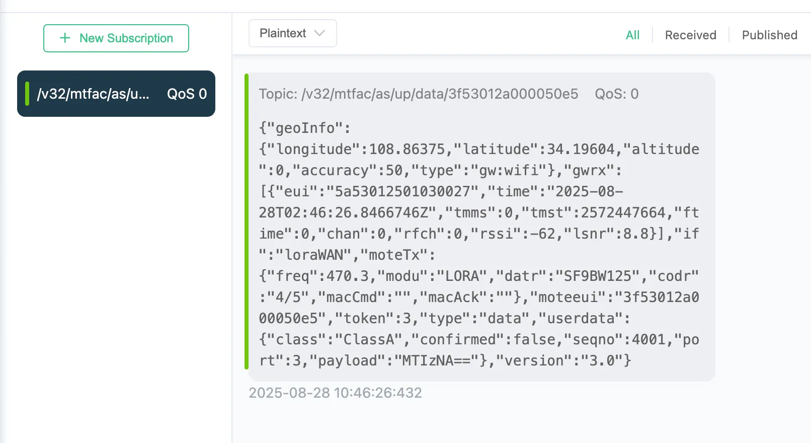 /v32/mtfac/as/up/data/#您可以使用 MQTTX 等MQTT客户端工具订阅该主题,实时查看设备发送的数据。
