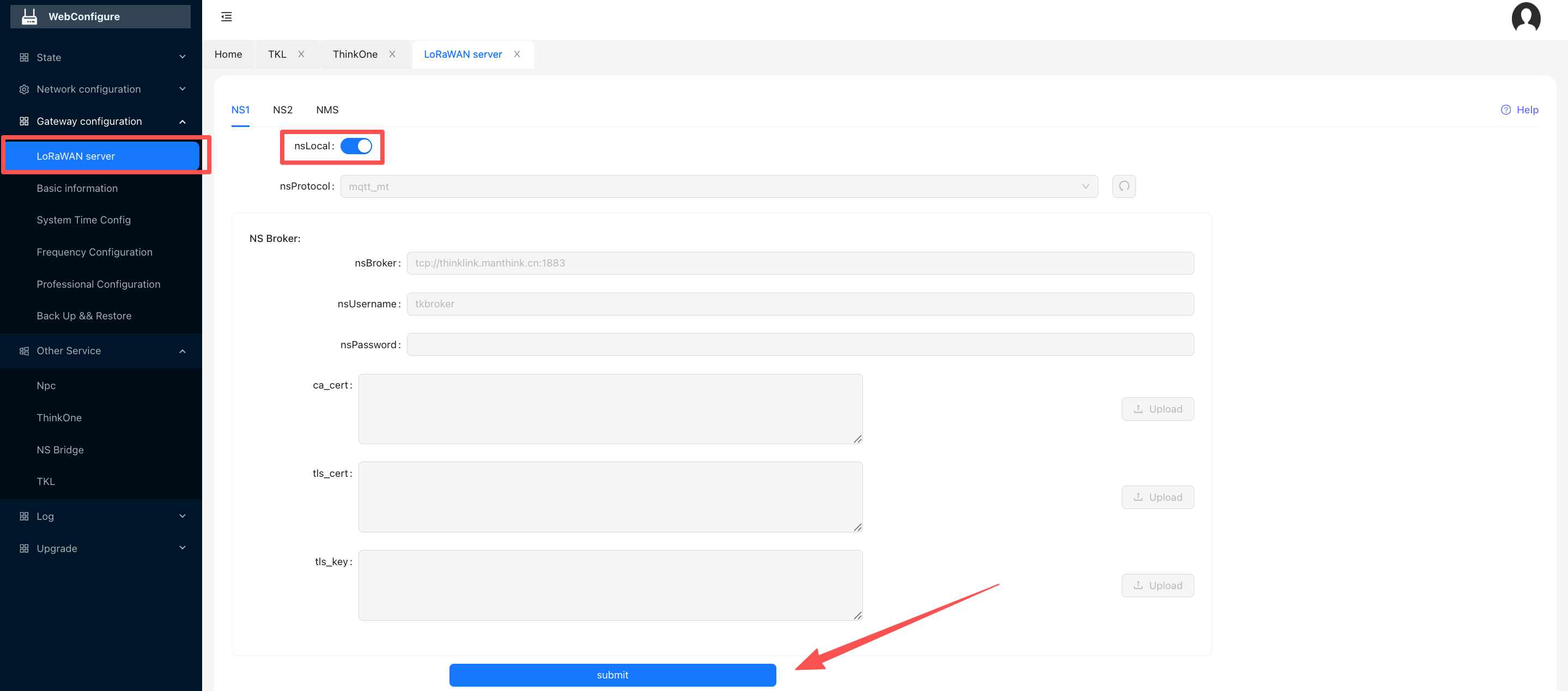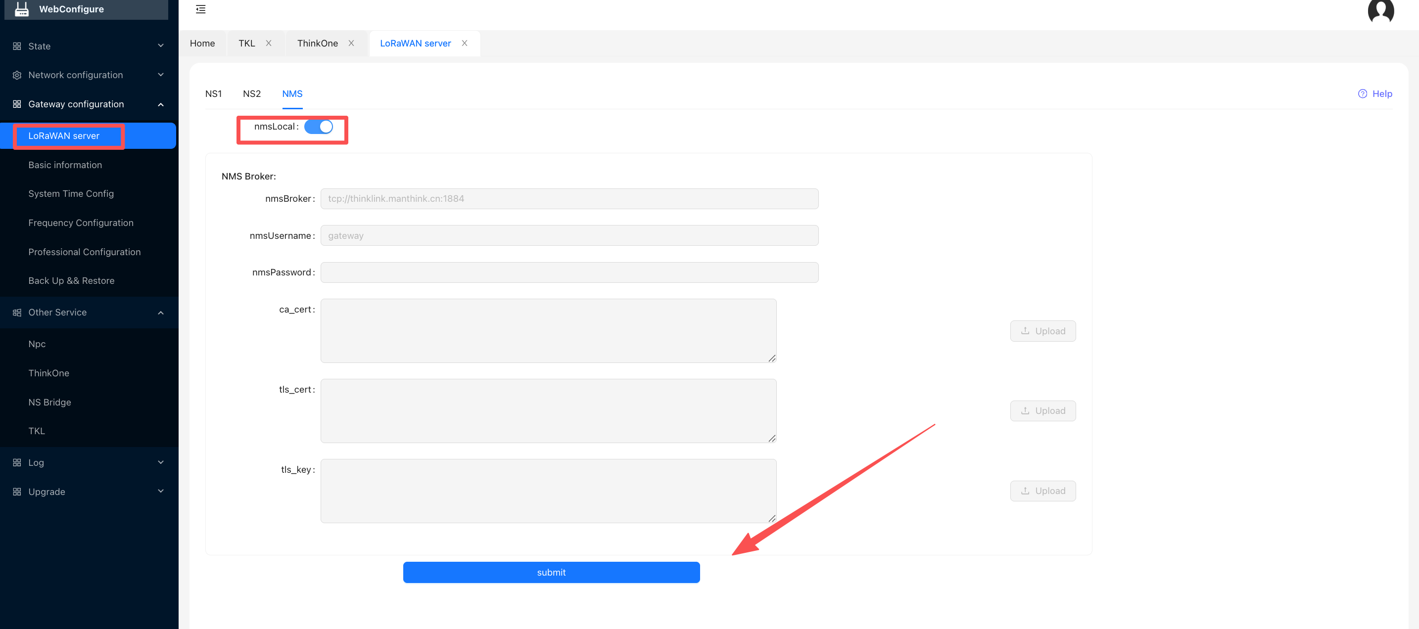 如下图所示,打开nmsLocal功能,开启后将通过网关内置的TKL对网关进行管理。所有配置完成后点击submit,完成配置。